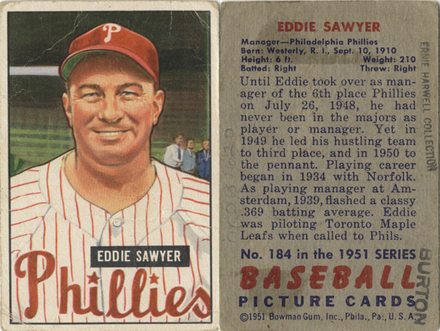 Portrait of Eddie Sawyer, manager for the Philadelphia Phillies. Bowman series. Printed on front: "Eddie Sawyer." Printed on back: "Eddie Sawyer. Manager, Philadelphia Phillies. Born: Westerly, R.I., Sept. 10, 1910. Height: 6 ft. Weight: 210. Batted: right. Threw: right. Until Eddie took over as manager of the 6th place Phillies on July 26, 1948, he had never been in the majors as player or manager. Yet in 1949 he led his hustling team to third place, and in 1950 to the pennant. Playing career began in 1934 with Norfolk. As playing manager at Amsterdam, 1939, flashed a classy .369 batting average. Eddie was piloting Toronto Maple Leafs when called to Phils. No. 184 in the 1951 series baseball picture cards. [Copyright] 1951 Bowman Gum, Inc., Phila., Pa., U.S.A."