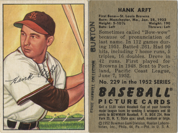 Portrait of Hank Arft, first baseman for the St. Louis Browns, holding a baseball bat. Bowman series. Printed on front: "Hank Arft." Printed on back: "Hank Arft. First base, St. Louis Browns. Born: Manchester, Mo., Jan. 28, 1922. Height: 5-10 1/2. Weight: 190. Bats: left. Throws: left. Sometimes called 'Bow-wow' because of pronunciation of last name. In 112 games during 1951. Batted .261. Had 90 hits, including 7 home runs, 5 triples, 16 doubles. Drove in 42 runs. First played for Browns in 1948. Sent to Portland, Pacific Coast League, June 7, 1952. No. 229 in the 1952 series Baseball picture cards. Get a $1.00 value baseball cap of your favorite major league team by sending 5 wrappers and 50 cents to Bowman baseball, P.O. Box 234, New York 23, N.Y. State size: small, medium or large. [Copyright] 1952 Bowman Gum Division, Haelan Laboratories, Inc., Phila. 44, Pa. Ptd. in U.S.A."