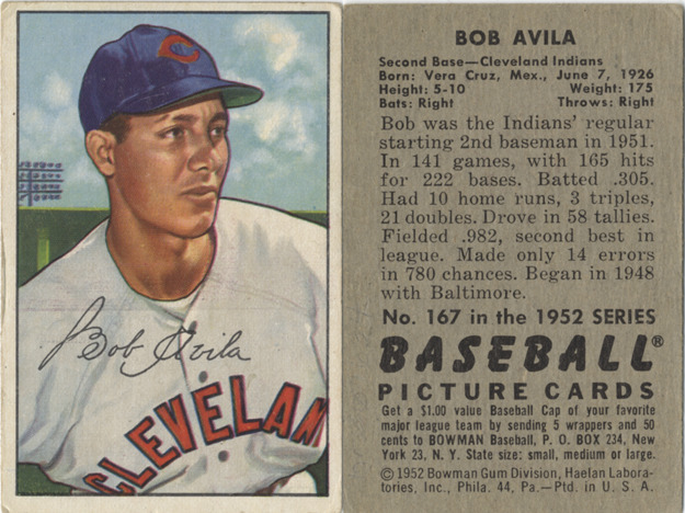 Portrait of Bobby Avila, second baseman for the Cleveland Indians. Bowman series. Printed on front: "Bob Avila." Printed on back: "Bob Avila. Second base, Cleveland Indians. Born: Vera Cruz, Mex., June 7, 1926. Height: 5-10. Weight: 175. Bats: right. Throws: right. Bob was the Indians' regular starting 2nd baseman in 1951. In 141 games, with 165 hits for 222 bases. Batted .305. Had 10 home runs, 3 triples, 21 doubles. Drove in 58 tallies. Fielded .982, second best in league. Made only 14 errors in 780 chances. Began in 1948 with Baltimore. No. 167 in the 1952 series Baseball picture cards. Get a $1.00 value baseball cap of your favorite major league team by sending 5 wrappers and 50 cents to Bowman baseball, P.O. Box 234, New York 23, N.Y. State size: small, medium or large. [Copyright] 1952 Bowman Gum Division, Haelan Laboratories, Inc., Phila. 44, Pa. Ptd. in U.S.A."