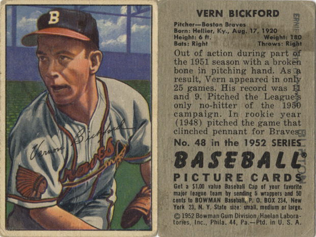 Portrait of Vern Bickford, pitcher for the Boston Braves. Bowman series. Printed on front: "Vernon Bickford." Printed on back: "Vern Bickford. Pitcher, Boston Braves. Born: Hellier, Ky., Aug. 17, 1920. Height: 6 ft. Weight: 180. Bats: right. Throws: right. Out of action during part of the 1951 season with a broken bone in pitching hand. As a result, Vern appeared in only 25 games. His record was 11 and 9. Pitched the League's only no-hitter of the 1950 campaign. In rookie year (1948) pitched the game that clinched pennant for Braves. No. 48 in the 1952 series Baseball picture cards. Get a $1.00 value baseball cap of your favorite major league team by sending 5 wrappers and 50 cents to Bowman baseball, P.O. Box 234, New York 23, N.Y. State size: small, medium or large. [Copyright] 1952 Bowman Gum Division, Haelan Laboratories, Inc., Phila. 44, Pa. Ptd. in U.S.A."