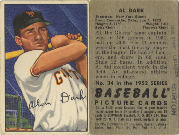 Portrait of Alvin Dark, shortstop for the New York Giants, holding a baseball bat. Bowman series. Printed on front: "Alvin Dark." Printed on back: "Al Dark. Shortstop, New York Giants. Born: Comanche, Okla., Jan. 7, 1923. Height: 5-11 1/2. Weight: 180. Bats: right. Throws: right. Al, Giants' team captain, was in 156 games in 1951, batting .303. His 41 doubles were the most for any player in the league. He had 14 homers, and drove in 69 runs. Stole 12 bases. In addition, Al did excellent work in the field. An all-around athlete when in college. No. 34 in the 1952 series Baseball picture cards. Get a $1.00 value baseball cap of your favorite major league team by sending 5 wrappers and 50 cents to Bowman baseball, P.O. Box 234, New York 23, N.Y. State size: small, medium or large. [Copyright] 1952 Bowman Gum Division, Haelan Laboratories, Inc., Phila. 44, Pa. Ptd. in U.S.A."