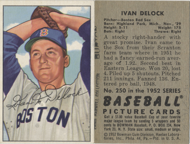 Portrait of Ike Delock, pitcher for the Boston Red Sox. Bowman series. Printed on front: "Ivan M. Delock." Printed on back: "Ivan Delock. Pitcher, Boston Red Sox. Born: Highland Park, Mich., Nov., 1929. Height: 5-11. Weight: 175. Bats: right. Throws: right. A stocky right-hander with great promise. Ivan came to the Sox from their Scranton farm team where in 1951 he had a fancy earned run average of 1.92. Second best in Eastern League. Won 20, lost 4. Piled up 5 shutouts. Pitched 211 innings. Fanned 136. Entered pro ball, 1948. No. 250 in the 1952 series Baseball picture cards. Get a $1.00 value baseball cap of your favorite major league team by sending 5 wrappers and 50 cents to Bowman baseball, P.O. Box 234, New York 23, N.Y. State size: small, medium or large. [Copyright] 1952 Bowman Gum Division, Haelan Laboratories, Inc., Phila. 44, Pa. Ptd. in U.S.A."