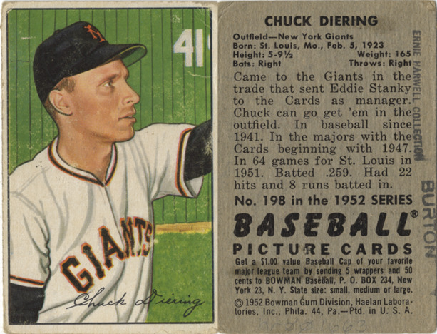 Portrait of Chuck Diering, outfielder for the New York Giants. Bowman series. Printed on front: "Chuck Diering." Printed on back: "Chuck Diering. Outfield, New York Giants. Born: St. Louis, Mo., Feb. 5, 1923. Height: 5-9 1/2. Weight: 165. Bats: right. Throws: right. Came to the Giants in the trade that sent Eddie Stanky to the Cards as manager. Chuck can go get 'em in the outfield. In baseball since 1941. In the majors with the Cards beginning with 1947. In 64 games for St. Louis in 1951. Batted .259. Had 22 hits and 8 runs batted in. No. 198 in the 1952 series Baseball picture cards. Get a $1.00 value baseball cap of your favorite major league team by sending 5 wrappers and 50 cents to Bowman baseball, P.O. Box 234, New York 23, N.Y. State size: small, medium or large. [Copyright] 1952 Bowman Gum Division, Haelan Laboratories, Inc., Phila. 44, Pa. Ptd. in U.S.A."