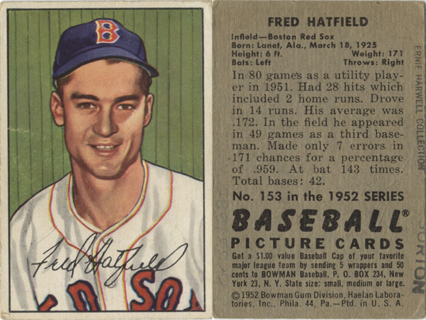 Portrait of Fred Hatfield, infielder for the Boston Red Sox. Bowman series. Printed on front: "Fred Hatfield." Printed on back: "Fred Hatfield. Infield, Boston Red Sox. Born: Lanet, Ala., March 18, 1925. Height: 6 ft. Weight: 171. Bats: left. Throws: right. In 80 games as a utility player in 1951. Had 28 hits which included 2 home runs. Drove in 14 runs. His average was .172. In the field he appeared in 49 games as a third baseman. Made only 7 errors in 171 chances for a percentage of .959. At bat 143 times. Total bases: 42. No. 153 in the 1952 series Baseball picture cards. Get a $1.00 value baseball cap of your favorite major league team by sending 5 wrappers and 50 cents to Bowman baseball, P.O. Box 234, New York 23, N.Y. State size: small, medium or large. [Copyright] 1952 Bowman Gum Division, Haelan Laboratories, Inc., Phila. 44, Pa. Ptd. in U.S.A."