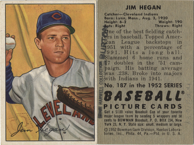 Portrait of Jim Hegan, catcher for the Cleveland Indians. Bowman series. Printed on front: "Jim Hegan." Printed on back: "Jim Hegan. Catcher, Cleveland Indians. Born: Lynn, Mass., Aug. 3, 1920. Height: 6-2. Weight: 190. Bats: right. Throws: right. One of the best fielding catchers in baseball. Topped American League backstops in 1951 with a percentage of .991. Hits a long ball. Slammed 6 home runs and 17 doubles in the '51 campaign. His batting average was .238. Broke into majors with Indians in 1941. No. 187 in the 1952 series Baseball picture cards. Get a $1.00 value baseball cap of your favorite major league team by sending 5 wrappers and 50 cents to Bowman baseball, P.O. Box 234, New York 23, N.Y. State size: small, medium or large. [Copyright] 1952 Bowman Gum Division, Haelan Laboratories, Inc., Phila. 44, Pa. Ptd. in U.S.A."