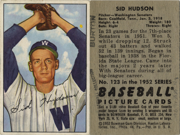 Portrait of Sid Hudson, pitcher for the Washington Senators. Bowman series. Printed on front: "Sid Hudson." Printed on back: "Sid Hudson. Pitcher, Washington Senators. Born: Coalfield, Tenn., Jan. 3, 1918. Height: 6-4. Weight: 180. Bats: right. Throws: right. In 23 games for the 7th-place Senators in 1951. Won 5, while dropping 12. Struck out 43 batters and walked 52 in 139 innings. Began in baseball in 1938 in the Florida State League. Came into the majors 2 years later. With Senators during all of big-league career. No. 123 in the 1952 series Baseball picture cards. Get a $1.00 value baseball cap of your favorite major league team by sending 5 wrappers and 50 cents to Bowman baseball, P.O. Box 234, New York 23, N.Y. State size: small, medium or large. [Copyright] 1952 Bowman Gum Division, Haelan Laboratories, Inc., Phila. 44, Pa. Ptd. in U.S.A."