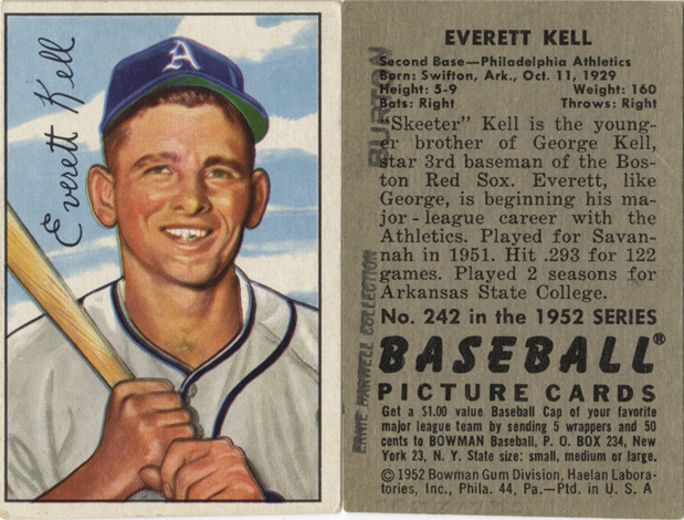 Portrait of Skeeter Kell, second baseman for the Philadelphia Athletics, holding a baseball bat. Bowman series. Printed on front: "Everett Kell." Printed on back: "Everett Kell. Second base, Philadelphia Athletics. Born; Swifton, Ark., Oct. 11, 1929. Height: 5-9. Weight: 160. Bats: right. Throws: right. 'Skeeter' Kell is the younger brother of George Kell, star third baseman of the Boston Red Sox. Everett, like George, is beginning his major-league career with the Athletics. Played for Savannah in 1951. Hit .293 for 122 games. Played 2 seasons for Arkansas State College. No. 242 in the 1952 series Baseball picture cards. Get a $1.00 value baseball cap of your favorite major league team by sending 5 wrappers and 50 cents to Bowman baseball, P.O. Box 234, New York 23, N.Y. State size: small, medium or large. [Copyright] 1952 Bowman Gum Division, Haelan Laboratories, Inc., Phila. 44, Pa. Ptd. in U.S.A."