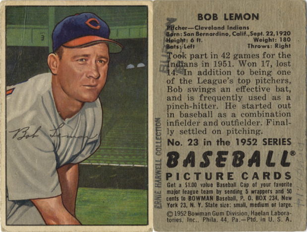 Portrait of Bob Lemon, pitcher for the Cleveland Indians. Bowman series. Printed on front: "Bob Lemon." Printed on back: "Bob Lemon. Pitcher, Cleveland Indians. Born: San Bernardino, Calif., Sept. 22, 1920. Height: 6 ft. Weight: 180. Bats: left. Throws: right. Took part in 42 games for the Indians in 1951. Won 17, lost 14. In addition to being one of the League's top pitchers, Bob swings an effective bat, and is frequently used as a pinch-hitter. He started out in baseball as a combination infielder and outfielder. Finally settled on pitching. No. 23 in the 1952 series Baseball picture cards. Get a $1.00 value baseball cap of your favorite major league team by sending 5 wrappers and 50 cents to Bowman baseball, P.O. Box 234, New York 23, N.Y. State size: small, medium or large. [Copyright] 1952 Bowman Gum Division, Haelan Laboratories, Inc., Phila. 44, Pa. Ptd. in U.S.A."