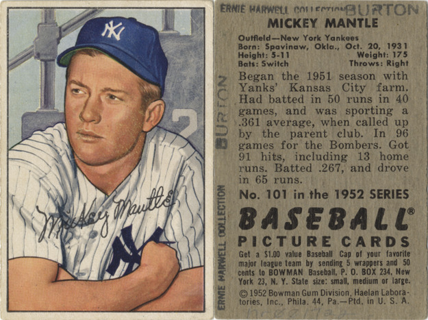 Portrait of Mickey Mantle, outfielder for the New York Yankees. Bowman series. Printed on front: "Mickey Mantle." Printed on back: "Mickey Mantle. Outfield, New York Yankees. Born: Spavinaw, Okla., Oct. 20, 1931. Height: 5-11. Weight: 175. Bats: switch. Throws: right. Began the 1951 season with Yanks' Kansas City farm. Had batted in 50 runs in 40 games, and was sporting a .361 average, when called up by the parent club. In 96 games for the Bombers. Got 91 hits, including 13 home runs. Batted .267, and drove in 65 runs. No. 101 in the 1952 series Baseball picture cards. Get a $1.00 value baseball cap of your favorite major league team by sending 5 wrappers and 50 cents to Bowman baseball, P.O. Box 234, New York 23, N.Y. State size: small, medium or large. [Copyright] 1952 Bowman Gum Division, Haelan Laboratories, Inc., Phila. 44, Pa. Ptd. in U.S.A."