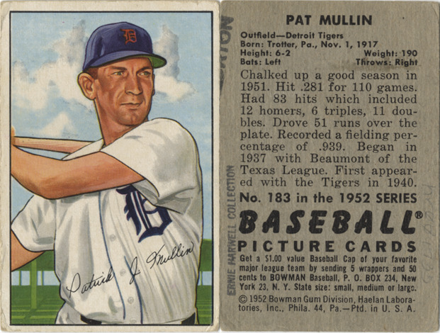 Portrait of Pat Mullin, outfielder for the Detroit Tigers, holding a baseball bat. Bowman series. Printed on front: "Patrick J. Mullin." Printed on back: "Pat Mullin. Outfield, Detroit Tigers. Born: Trotter, Pa., Nov. 1, 1917. Height: 6-2. Weight: 190. Bats: left. Throws: right. Chalked up a good season in 1951. Hit .281 for 110 games. Had 83 hits which included 12 homers, 6 triples, 11 doubles. Drove 51 runs over the plate. Recorded a fielding percentage of .939. Began in 1937 with Beaumont of the Texas League. First appeared with the Tigers in 1940. No. 183 in the 1952 series Baseball picture cards. Get a $1.00 value baseball cap of your favorite major league team by sending 5 wrappers and 50 cents to Bowman baseball, P.O. Box 234, New York 23, N.Y. State size: small, medium or large. [Copyright] 1952 Bowman Gum Division, Haelan Laboratories, Inc., Phila. 44, Pa. Ptd. in U.S.A."