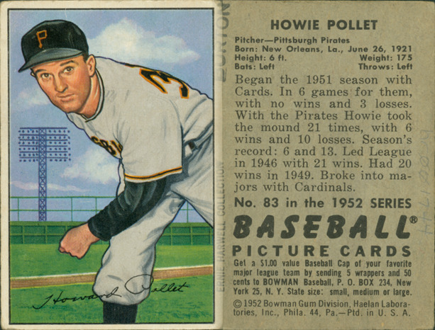 Portrait of Howie Pollet, pitcher for the Pittsburgh Pirates. Bowman series. Printed on front: "Howard Pollet." Printed on back: "Howie Pollet. Pitcher, Pittsburgh Pirates. Born: New Orleans, La., June 26, 1921. Height: 6 ft. Weight: 175. Bats: left. Throws: left. Began the 1951 season with Cards. In 6 games for them, with no wins and 3 losses. With the Pirates Howie took the mound 21 times, with 6 wins and 10 losses. Season's record: 6 and 13. Led League in 1946 with 21 wins. Had 20 wins in 1949. Broke into majors with Cardinals. No. 83 in the 1952 series Baseball picture cards. Get a $1.00 value baseball cap of your favorite major league team by sending 5 wrappers and 50 cents to Bowman baseball, P.O. Box 234, New York 23, N.Y. State size: small, medium or large. [Copyright] 1952 Bowman Gum Division, Haelan Laboratories, Inc., Phila. 44, Pa. Ptd. in U.S.A."