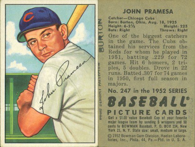 Portrait of Johnny Pramesa, catcher for the Chicago Cubs, holding a baseball bat. Bowman series. Printed on front: "John Pramesa." Printed on back: "John Pramesa. Catcher, Chicago Cubs. Born: Barton, Ohio, Aug. 18, 1925. Height: 6-2 1/2. Weight: 225. Bats: right. Throws: right. One of the biggest catchers in the game. The Cubs obtained his services from the Reds for whom he played in 1951, batting .229 for 72 games. Hit 6 homers, 2 triples, 5 doubles. Drove in 22 runs. Batted .307 for 74 games in 1950, first full season in majors. No. 247 in the 1952 series Baseball picture cards. Get a $1.00 value baseball cap of your favorite major league team by sending 5 wrappers and 50 cents to Bowman baseball, P.O. Box 234, New York 23, N.Y. State size: small, medium or large. [Copyright] 1952 Bowman Gum Division, Haelan Laboratories, Inc., Phila. 44, Pa. Ptd. in U.S.A."