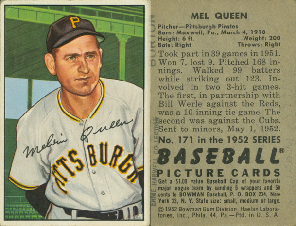 Portrait of Mel Queen, pitcher for the Pittsburgh Pirates. Bowman series. Printed on front: "Melvin Queen." Printed on back: "Mel Queen. Pitcher, Pittsburgh Pirates. Born: Maxwell, Pa., March 4, 1918. Height: 6 ft. Weight: 200. Bats: right. Throws: right. Took part in 39 games in 1951. Won 7, lost 9. Pitched 168 innings. Walked 99 batters while striking out 123. Involved in two 3-hit games. The first, in partnership with Bill Werle against the Reds, was a 10-inning tie game. The second was against the Cubs. Sent to minors, May 1, 1952. No. 171 in the 1952 series Baseball picture cards. Get a $1.00 value baseball cap of your favorite major league team by sending 5 wrappers and 50 cents to Bowman baseball, P.O. Box 234, New York 23, N.Y. State size: small, medium or large. [Copyright] 1952 Bowman Gum Division, Haelan Laboratories, Inc., Phila. 44, Pa. Ptd. in U.S.A."