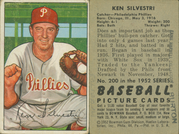 Portrait of Ken Silvestri, catcher for the Philadelphia Phillies. Bowman series. Printed on front: "Ken Silvestri." Printed on back: "Ken Silvestri. Catcher, Philadelphia Phillies. Born: Chicago, Ill., May 3, 1916. Height: 6-1. Weight: 200. Bats: both. Throws: right. Does an important job as the Phillies' bull-pen catcher. Got into only 4 games last year. Had 2 hits, and batted in a run. Began in baseball in 1936. First played in majors with White Sox in 1939. Traded to the Yankees. Drafted by Phils from Newark in November, 1948. No. 200 in the 1952 series Baseball picture cards. Get a $1.00 value baseball cap of your favorite major league team by sending 5 wrappers and 50 cents to Bowman baseball, P.O. Box 234, New York 23, N.Y. State size: small, medium or large. [Copyright] 1952 Bowman Gum Division, Haelan Laboratories, Inc., Phila. 44, Pa. Ptd. in U.S.A."
