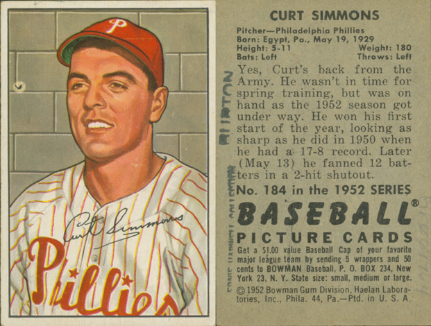Portrait of Curt Simmons, pitcher for the Philadelphia Phillies. Bowman series. Printed on front: "Curt Simmons." Printed on back: "Curt Simmons. Pitcher, Philadelphia Phillies. Born: Egypt, Pa., May 19, 1929. Height: 5-11. Weight: 180. Bats: left. Throws: left. Yes, Curt's back from the Army. He wasn't in time for spring training, but was on hand as the 1952 season got under way. He won his first start of the year, looking as sharp as he did in 1950 when he had a 17-8 reocrd. Later (May 13) he fanned 12 batters in a 2-hit shutout. No. 184 in the 1952 series Baseball picture cards. Get a $1.00 value baseball cap of your favorite major league team by sending 5 wrappers and 50 cents to Bowman baseball, P.O. Box 234, New York 23, N.Y. State size: small, medium or large. [Copyright] 1952 Bowman Gum Division, Haelan Laboratories, Inc., Phila. 44, Pa. Ptd. in U.S.A."