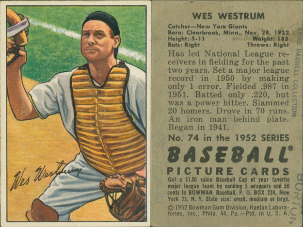 Portrait of Wes Westrum, catcher for the New York Giants. Bowman series. Printed on front: "Wes Westrum." Printed on back: "Wes Westrum. Catcher, New York Giants. Born: Clearbrook, Minn., Nov. 28, 1922. Height: 5-11. Weight: 185. Bats: right. Throws: right. Has led National League receivers in fielding for the past two years. Set a major league record in 1950 by making only 1 error. Fielded .987 in 1951. Batted only .220, but was a power hitter. Slammed 20 homers. Drove in 70 runs. An iron man behind plate. Began in 1941. No. 74 in the 1952 series Baseball picture cards. Get a $1.00 value baseball cap of your favorite major league team by sending 5 wrappers and 50 cents to Bowman baseball, P.O. Box 234, New York 23, N.Y. State size: small, medium or large. [Copyright] 1952 Bowman Gum Division, Haelan Laboratories, Inc., Phila. 44, Pa. Ptd. in U.S.A."