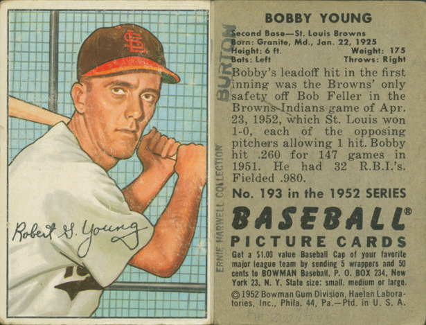 Portrait of Bobby Young, second baseman for the St. Louis Browns, holding a baseball bat. Bowman series. Printed on front: "Robert G. Young." Printed on back: "Bobby Young. Second base, St. Louis Browns. Born: Granite, Md., Jan. 22, 1925. Height: 6 ft. Weight: 175. Bats: left. Throws: right. Bobby's leadoff hit in the first inning was the Browns' only safety off Bob Feller in the Browns-Indians game of Apr. 23, 1952, which St. Louis won 1-0, each of the opposing pitchers allowing 1 hit. Bobby hit .260 for 147 games in 1951. He had 32 R.B.I.'s. Fielded .980. No. 193 in the 1952 series Baseball picture cards. Get a $1.00 value baseball cap of your favorite major league team by sending 5 wrappers and 50 cents to Bowman baseball, P.O. Box 234, New York 23, N.Y. State size: small, medium or large. [Copyright] 1952 Bowman Gum Division, Haelan Laboratories, Inc., Phila. 44, Pa. Ptd. in U.S.A."