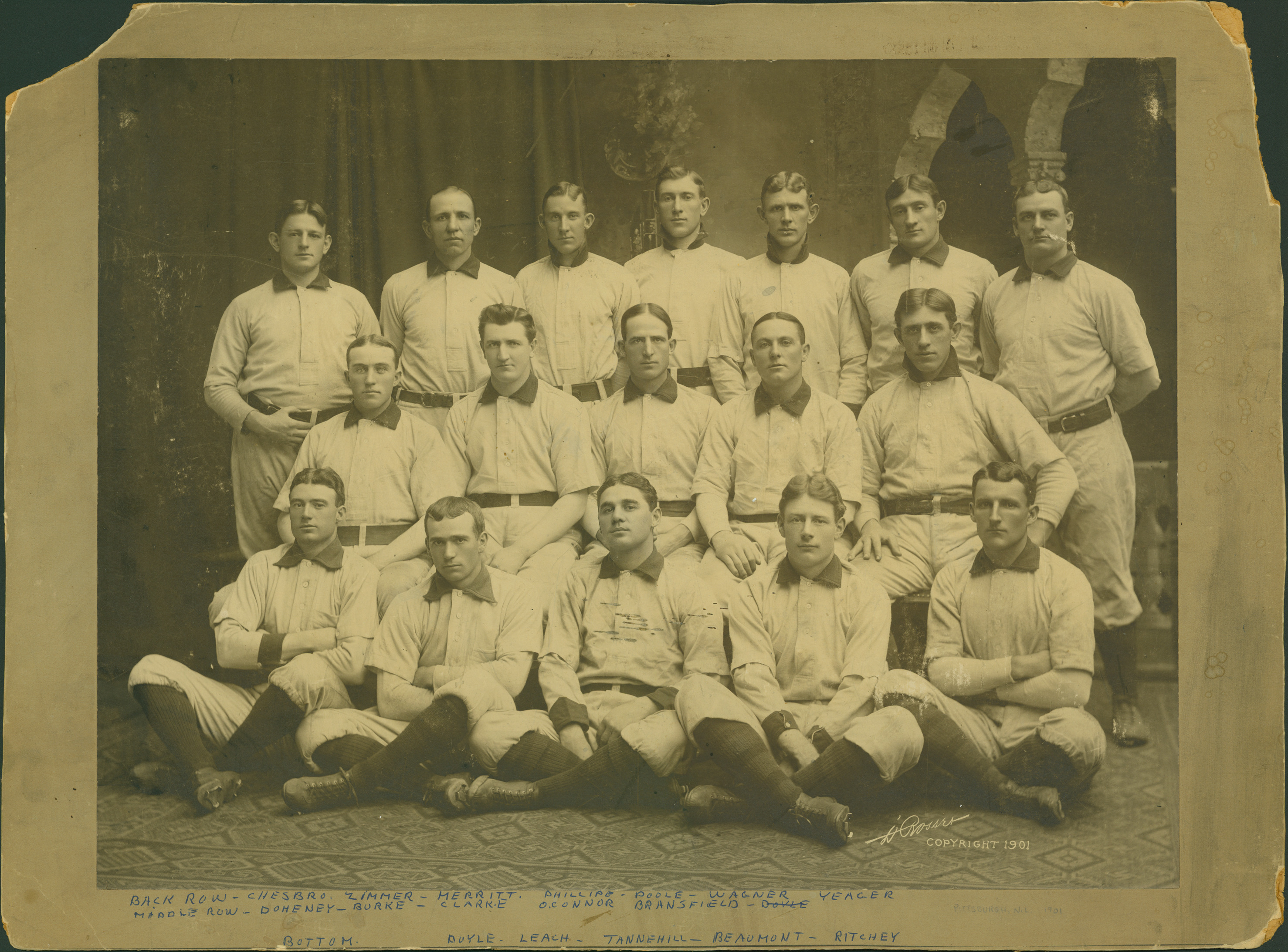 Favorite this☆ 1901 Pittsburgh Pirates Description: Group portrait of 1901 Pittsburgh Pirates; uniformed players posed in studio in front of painted backdrop. Printed on photograph front: "H. Rosser. Copyright 1901." Handwritten on mat: "Back row-Chesbro, Zimmer, Merritt, Phillipe, Poole, Wagner, Yeager; middle row-Doheney [Doheny], Burke, Clarke, O'Connor, Bransfield, Doyle [crossed out]; bottom-Doyle, Leach, Tannehill, Beaumont, Ritchey. Pittsburgh, N.L. 1901." Details Resource ID: hr001798 Subject: Rosser, H. Pittsburgh Pirates (Baseball team) Baseball players--Pennsylvania--Pittsburgh Baseball teams--Pennsylvania--Pittsburgh Photographic prints Date Issued: 1901 Format: 1 photographic print mounted on mat board ; image 12.75 x 17 in. Member of: Ernie Harwell Sports Collection Filing Location: Photographs-Oversize Rights: Physical rights are retained by DPL. Copyright is retained in accordance with U.S. copyright laws.