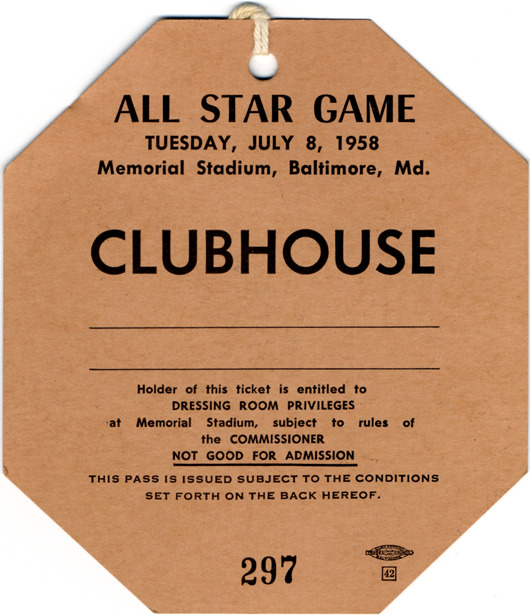 Clubhouse pass for Memorial Stadium at All-Star Game. Printed on front: "All Star Game. Tuesday, July 8, 1958. Memorial Stadium, Baltimore, Md. Clubhouse. [Blank] Holder of this ticket is entitled to dressing room privileges at Memorial Stadium, subject to rules of the commissioner. Not good for admission. This pass is issued subject to the conditions set forth on the back hereof. 297. Allied Printing, Baltimore. Trades Council union label. 42." Printed on back: "The bearer hereof is hereby granted a license to be admitted to the 1958 All-Star Game, upon the following conditions: The bearer of this license, and his employer, by acceptance and use of this license, represent and agree that bearer is a bona fide employee of a newspaper, press, news, telegraph, photographic, radio broadcasting or telecasting service and actually engaged as such in attending the 1958 All-Star Game for which this license is issued and used; and agree that they will not transmit or aid in transmitting any description, account, picture or reproduction of said game to which the bearer is so admitted, except as authorized in writing by the Commissioner of Baseball. The bearer of this license and his employer assume all risk incidental to the performance by the bearer of his services in connection with the 1958 All-Star Game and assume all risk incidental to the game of baseball, including specifically (but not exclusively) the risk of being injured by thrown or batted balls, and agree that the management is not liable for injuries resulting from such causes. This license is not tranferable and will automatically terminate if any of the above conditions or agreements are breached. Baltimore Baseball Club, Inc., agent."