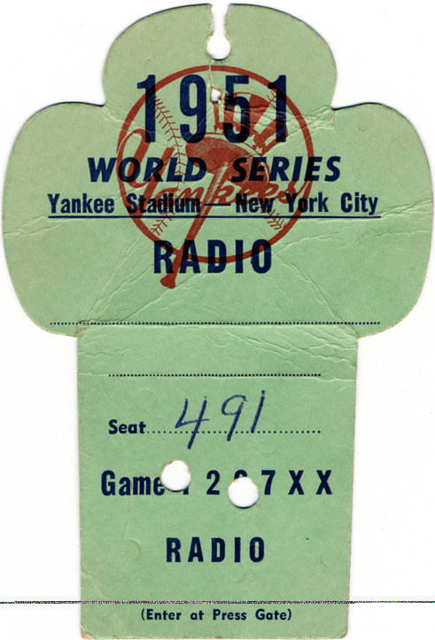 Press pass for 1951 World Series. Printed on front: red "Yankees" logo watermark, with ball, bat, and stars and stripes hat; "1951 World Series. Yankee Stadium, New York City. Radio. [Blank] Seat [491]. Game [1 punched out], 2, [6 punched out], 7, X, X. Radio. (Enter at press gate.)" Printed on back: "The office of the Baseball Commissioner, the American and National Leagues of Professional Baseball Clubs and the clubs participating in the 1951 World Series hereby grant the bearer hereof a license to be admitted to the 1951 World Series games designated hereon, and for which same is or may be used by the bearer, upon the following conditions: The bearer of this license and his employer, by acceptance and use of this license, represent and covenant that bearer is a bona fide employe [sic] of a newspaper, press, news, telegraph or photographic service, and actually engaged as such in attending the game or games for which this license is issued and used; and agree that they will not, directly or indirectly, transmit or aid in transmitting any news, accounts, reports or results, either partial or complete, of such game or games, during the progress of the game, beyond the limits of the park in which the game is played, except to bearer's employer for the sole purpose of newpaper publication and not for use, directly or indirectly, for any other purpose (including specifically but not exclusively any and all methods of broadcasting or reproduction) until after termination of the game involved. This lice[nse] is not [tra]nsferable and will [be revoked] by the office of the Baseball Commissioner if presented by any other person than the licensee to whom issued, or if any condition attaching to its issuance is violated. Mel Allen, in charge of radio arrangements. Allied Printing, Hudson County. Trades Council union label. 32."