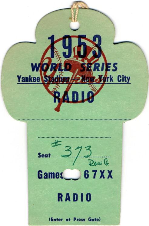 Press pass for 1953 World Series. Printed on front: red "Yankees" logo watermark, with ball, bat, and stars and stripes hat; "1953 World Series. Yankee Stadium, New York City. Radio. [Blank] Seat [#373, row G]. Games [1 and 2 punched out], 6, 7, X, X. Radio. (Enter at press gate.)" Printed on back: "The Commissioner of Baseball and the clubs participating in the 1953 World Series hereby grant the bearer hereof a license to be admitted to the 1953 World Series games designated hereon, upon the following conditions: The bearer of this license and his employer, by acceptance and use of this license, represent and agree that bearer is a bona fide employee of a newspaper, press, news, telegraph, photographic, radio broadcasting or telecasting service, and actually engaged as such in attending any game for which this license is issued and used; and agree that they will not transmit or aid in transmitting any description, account, picture or reproduction of any game to which the bearer is so admitted, except as authorized by the Commissioner of Baseball. This lice[nse is] not transferable and [will] automatically terminate if any of the above conditions or agreements are breached. Ford C. Frick, Commissioner of Baseball. Allied Printing, Hudson County. Trades Council union label. 32."