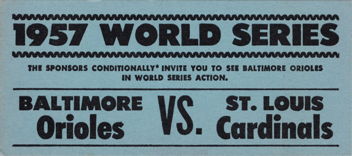 Ticket for unspecified 1957 World Series game. Printed on front: "1957 World Series. The sponsors conditionally* invite you to see Baltimore Orioles in World Series action. Baltimore Orioles vs. St. Louis Cardinals." No footnote corresponding to asterisk.
