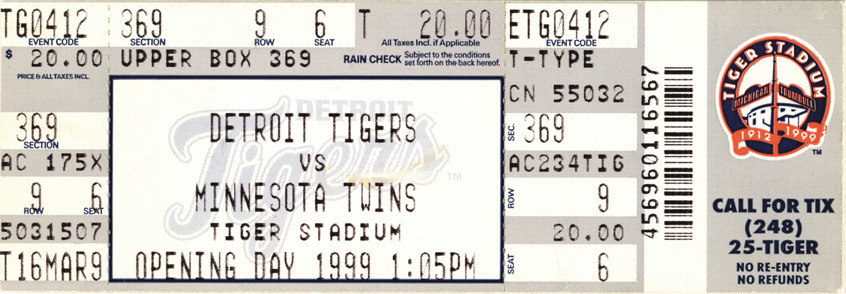 Computer printed ticket for opening day game at Tiger Stadium. Printed on front: Image of stadium with "Tiger Stadium, Michigan, Trumbull, 1912-1999", "Call for tix (248) 25-TIGER. No re-entry, no refunds," and "Rain check, subject to the conditions set forth on the back hereof." Seating and game information printed over "Detroit Tigers" watermark: "Detroit Tigers vs. Minnesota Twins, Tiger Stadium, opening day, 1999, 1:05PM. Event code TG0412, section 369, row 9, seat 6. T. 20.00, all taxes incl. if applicable. Event code ETG0412. Price, all taxes included, $20.00. Upper box 369. T-type. CN 55032. Section 369, AC 175X, row 9, seat 6. 5031507. Sec. 369, AC234TIG, row 9, 20.00, seat 6. T16MAR9." Printed on back: "Fox Sports Net, Detroit. Your Tigers. Fox attitude [trademark]. The holder is admitted on condition, and by the use of this ticket agrees, that he will not transmit or aid in transmitting any description, account, picture or reproduction of the baseball game or exhibition to which this ticket admits him. Breach of the foregoing will automatically terminate this license. The holder grants permission to the Detroit Tigers, Inc. and the other participating club and their agents to utilize holder's image or likeness incidental to any live or recorded video display or other transmission or reproduction in whole or in part of the event to which this ticket admits him. The holder assumes all risk and danger incidental to the game of baseball, including specifically (but not exclusively) the danger of being injured by thrown bats and thrown or batted balls, and agrees that the commissioner, the participating clubs, their agents and players, are not liable for injuries resulting from such causes. In the event 5 innings of one game are not played, except when the home team is in the lead at the end of 4 1/2 innings, this rain check may be exchanged for a ticket of equal value to a succeeding game during this season. Season ticket and special plan rain checks are governed by season ticket policies and may not always qualify for an exchange. Final disposition will be at the sole discretion of the Detroit Tigers, Inc. The license granted by this ticket may also be terminated by tendering to the holder the purchase price of this ticket. This ticket may not be used for advertising, promotion (including contests and sweepstakes) or other trade purposes without the express written consent of the Detroit Tigers, Inc. This ticket must not be resold or offered for resale in a manner or at a price in violation of any federal, state or local law or regulation. Bottles, cans, liquid containers, horns, and laser devices are not permitted in the stadium. No re-entry. No refunds. For season and group tickets call (313) 963-2050. Weldon, Williams and Lick. Fox Sports News. Keith Olbermann on Fox Sports News. Mornings 6:30a.m. Nightly 10p.m. 064350."