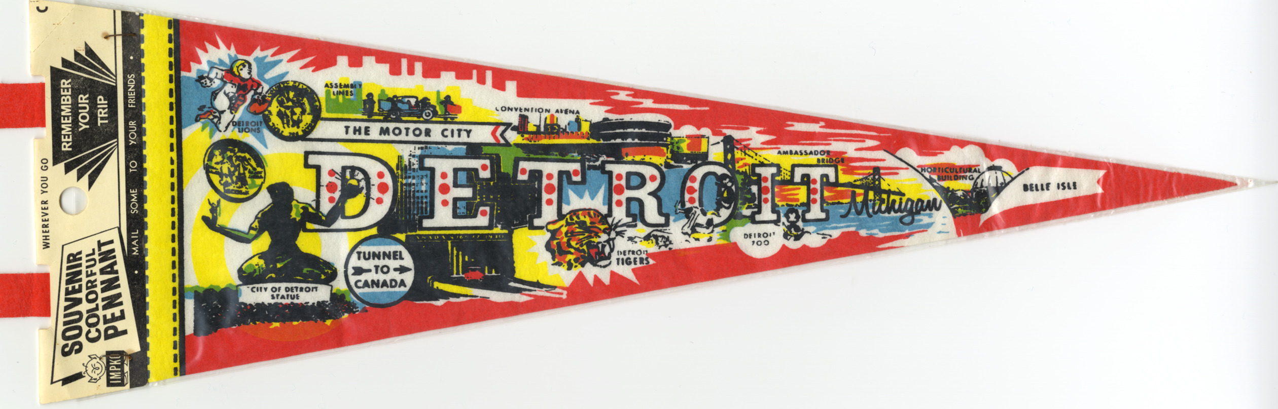 Labeled images printed on pennant front: "Detroit Lions," "Assembly lines," "The motor city," "Convention arena," "Detroit, Michigan," "Ambassador Bridge," "Horticultural building," "Belle Isle," "City of Detroit statue" [aka Spirit of Detroit], "Tunnel to Canada," "Detroit Tigers," "Detroit Zoo." Printed on label front: "Wherever you go. Souvenir colorful pennant. Remember your trip. IMPKO. Mail some to your friends." Printed on label back: "From" and "To" address areas. "Made in U.S.A. Print art products. IMPKO. Hackensack, N.J."