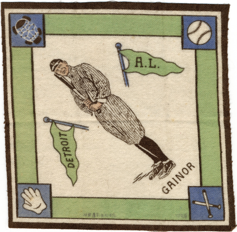 Favorite this☆ Del Gainer baseball felt Description: Flannel square laid out as diamond with picture of Del Gainer, in Detroit Tigers uniform, holding bat. Printed under player "Gainor" [sic]; on pennants "Detroit" and "A.L." Images in corners of baseball mitt, catcher's mask, baseball and bats. Details Resource ID: hr001833 Subject: Gainer, Del (Dellos Clinton), 1886-1947 Detroit Tigers (Baseball team) Baseball players--Michigan--Detroit American League of Professional Baseball Clubs Souvenirs (Keepsakes) Date Issued: 1914 (year approximate) Format: 1 baseball felt : col. ; 5.5 x 5.5 in. Member of: Ernie Harwell Sports Collection Filing Location: Memorabilia-Baseball felts-Gainer, Del Rights: Physical rights are retained by DPL. Copyright is retained in accordance with U.S. copyright laws.