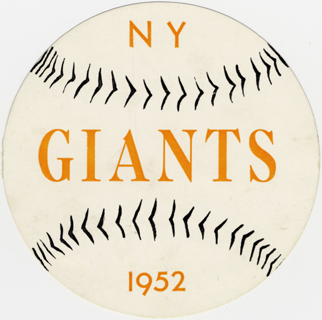 Favorite this☆ New York Giants sticker Description: Circular sticker for New York Giants, with simulated baseball seam stitching. Printed on front: "N.Y. Giants. 1952." Details Resource ID: hr001837 Subject: New York Giants (Baseball team) Stickers Date Issued: 1952 Format: 1 sticker : col. ; 4.25 in. Member of: Ernie Harwell Sports Collection Filing Location: Memorabilia-Stickers Rights: Physical rights are retained by DPL. Copyright is retained in accordance with U.S. copyright laws.