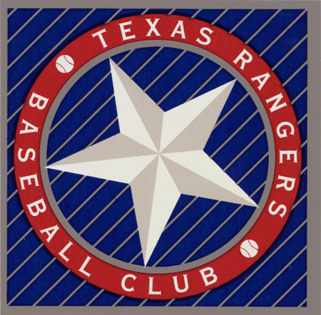 Square sticker with raised-effect star and red text circle on pinstriped blue and gray background. Printed on sticker front: "Texas Rangers. Baseball club." Printed on sticker back: "Rangers" trademarked logo on banner over star; "Buy one - get one free. Valid for any upper box, upper reserved or upper home run porch ticket for any Texas Rangers 2001 April, May, August or September home game except opening day. Redeemable at the first base ticket office any time after February 15, 2001. Subject to availability. For more information call (817) 273-5100. To view ballpark seating diagram go to www.texasrangers.com."
