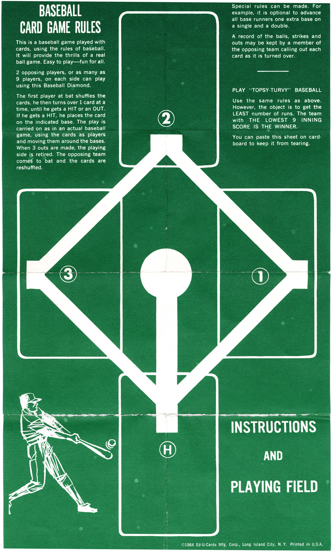Playing field for baseball card game, laid out as diamond with bases and pitcher's mound. Printed on front: "Baseball card game rules. This is a baseball game played with cards, using the rules of baseball. ... 2 opposing players, or as many as 9 players, on each side can play using this baseball diamond. The first player at bat shuffles the cards, he then turns over 1 card at a time, until he gets a hit or an out. If he gets a hit, he places the card on the indicated base. The play is carried on as in an actual baseball game, using the cards as players and moving them around the bases. When 3 outs are made, the playing side is retired. The opposing team comes to bat and the cards are reshuffled. Special rules can be made. For example, it is optional to advance all base runners one extra base on a single and a double. A record of the balls, strikes and outs may be kept by a member of the opposing team calling out each card as it is turned over. Play 'topsy-turvy' baseball. Use the same rules as above. However, the object is to get the least number of runs. The team with the lowest 9 inning score is the winner. You can paste this sheet on cardboard to keep it from tearing. Instructions and playing field. [copyright] 1964 Ed-U-Cards Mfg. Corp., Long Island City, N.Y. Printed in U.S.A."