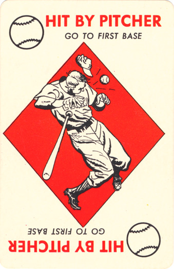 Playing card showing uniformed baseball player dropping bat after being hit by ball, superimposed over red diamond. Printed top and bottom on front: "[baseball], hit by pitcher, go to first base." Roaring tiger in circle on back. Printed on back: "Ed-u-cards [registered]."