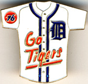 Favorite this☆ Detroit Tigers jersey pin Description: Cloisonne pin shaped as jersey. Printed on front: "76 [in circle]. Go Tigers. [Old English] D." Embossed on back: "Unocal. R [in circle]. 6." Details Resource ID: hr001867 Subject: Detroit Tigers (Baseball team) Stickpins Souvenirs (Keepsakes) Publisher: Unocal Corporation Date Issued: Unknown year Format: 1 button (information artifacts) : col. ; 1.25 x 1.25 in. Member of: Ernie Harwell Sports Collection Filing Location: Harwell Room Rights: Physical rights are retained by DPL. Copyright is retained in accordance with U.S. copyright laws.