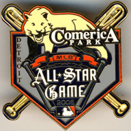 Cloisonne pin shaped as stylized home plate with crossed bats behind. Unstriped tiger at top. Printed on front: "Comerica Park. Detroit. MLB. All-Star Game. 2005." Embossed on back: "Peter David/MLBP 2005. www.peterdavid.com. 1-800-369-7487. Made in China."