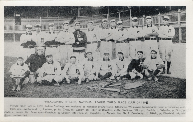 Photograph of 1898 Philadelphia Athletics standing and sitting on field. Printed on front: "Philadelphia Phillies, National League third place club of 189[8? changed in ink; original and changed date unclear]. Picture taken late in 1898, before Stallings was replaced as manager by Shettsline. Otherwise, '98 players formed great team of following year. Back row - McFarland, c; Jamison, p; M. Cross, ss; Cooley, cf; Piatt, p.; Douglass, c-1b; Stallings, '98 mgr.; Dunkle, p; Wheeler, p; Orth, p; Doyle [Boyle], c; Lajoie, 2b. Front row - Donahue, p; Lauder, inf; Flick, rf; Duggleby, p; Abbaticchio, 3b; E. Delahanty, lf; Fifield, p; Elberfeld, inf; last player, unidentified."