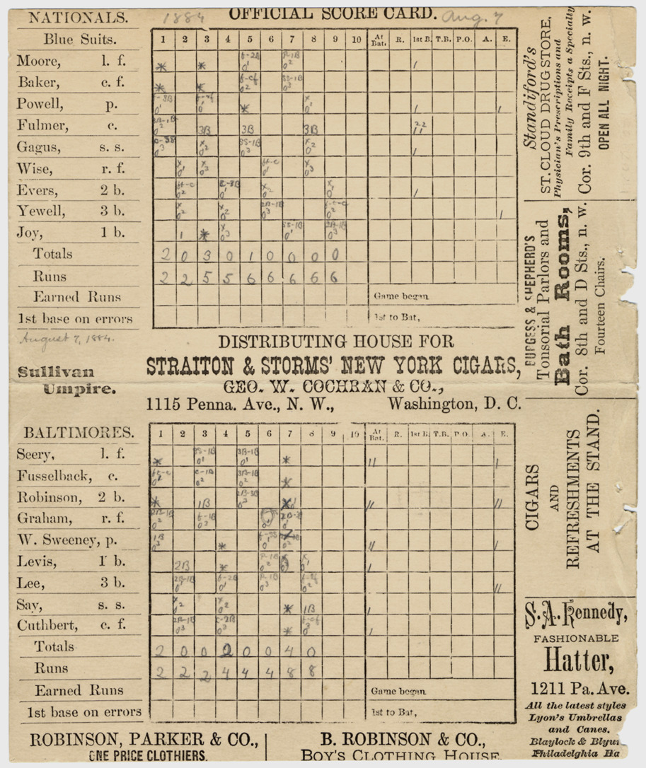 Scorecard for 1884 baseball game between Washington Nationals and Baltimore Monumentals; advertisements printed on borders of card. Printed on card: "Official score card. Nationals, Blue Suits. Baltimores." Handwritten on card: "August 7, 1884." Penciled notations on scorecard.