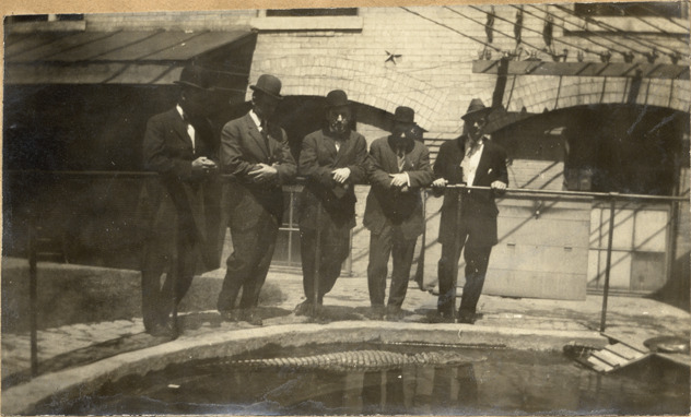 View of baseball players Ed Summers, Claude Rossman, Bill Donovan, Germany Schaefer and George Moriarty of the Detroit Tigers posing in front of crocodile pond in San Antonio, Texas. Handwritten below photograph: "Summers, Rossman, Donovan, Schaefer & Moriarty. San Antonio."