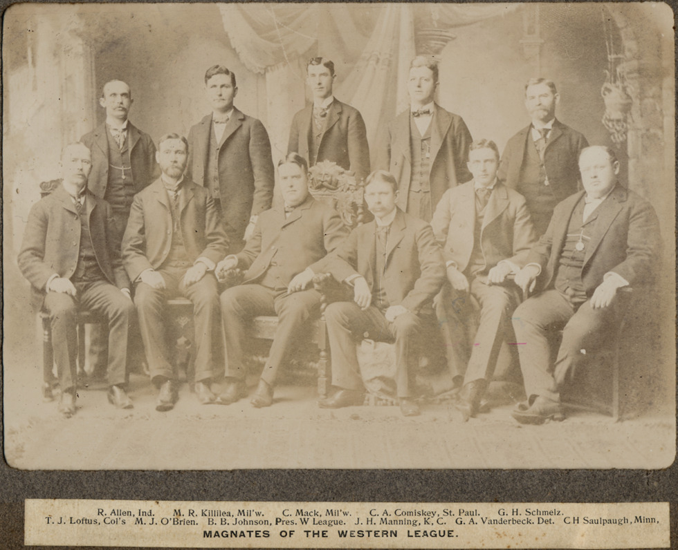 Group portrait of managers of Western League baseball teams. Caption below photograph: "Magnates of the Western League. R. Allen, Ind.; M.R. Killilea, Mil'w.; C. Mack, Mil'w.; C.A. Comiskey, St. Paul; G.H. Schmelz; T.J. Loftus, Col's; M.J. O'Brien; B.B. Johnson, pres. W. League; J.H. Manning, K,C.; G.A. Vanderbeck, Det.; C.H. Saulpaugh, Minn."