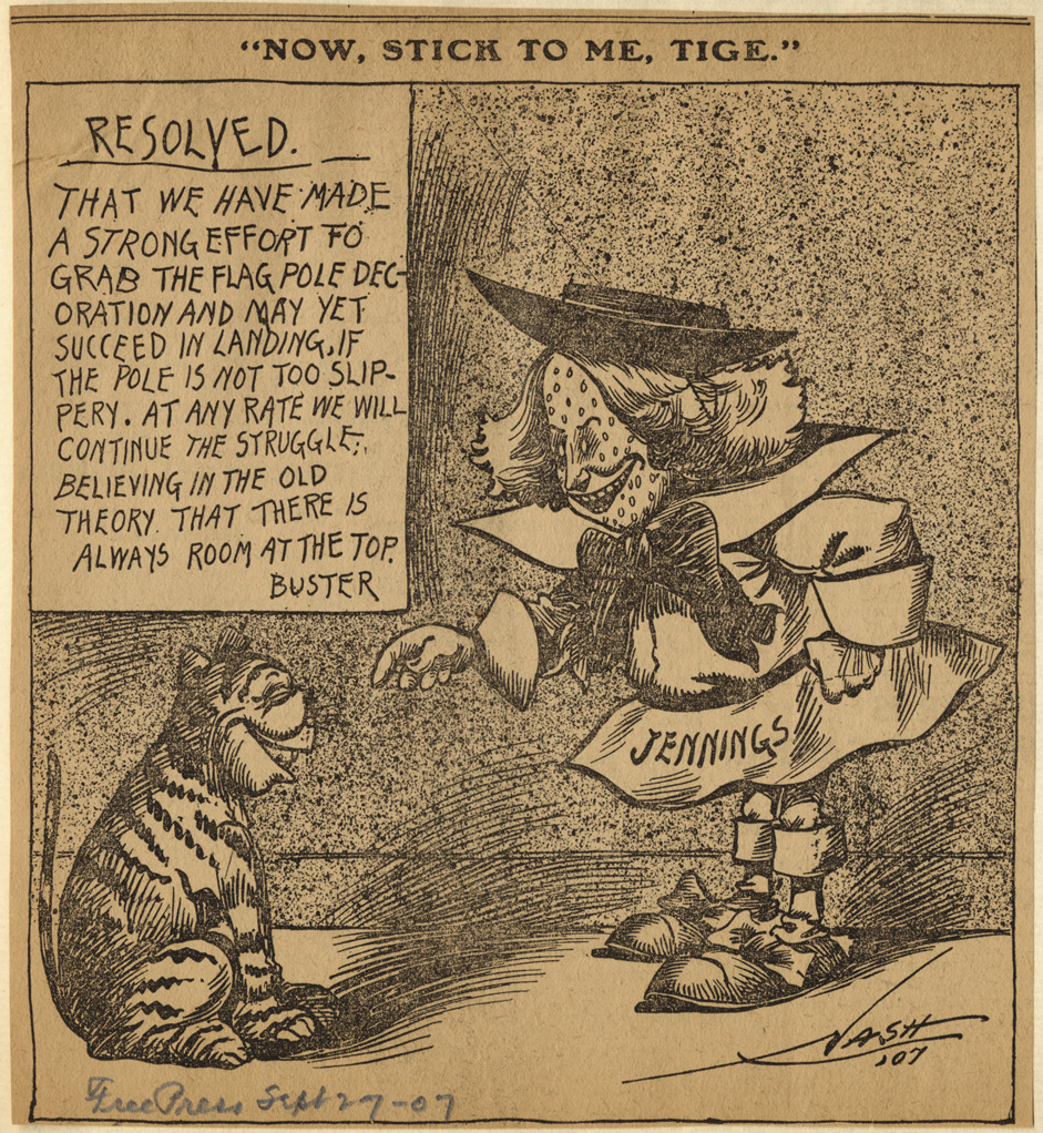 Detroit Free Press newspaper cartoon depicting baseball player Hughie Jennings dressed as Buster Brown speaking to small tiger. Printed on cartoon: "Resolved that we have made a strong effort to grab the flag pole decoration and may yet succeed in landing, if the pole is not too slippery. At any rate we will continue the struggle, believing in the old theory that there is alway room at the top. Buster." Caption on cartoon: "Now, stick to me, tige." Artwork is signed "Nash '07." Handwritten on front: "Free Press, Sept 27-07."