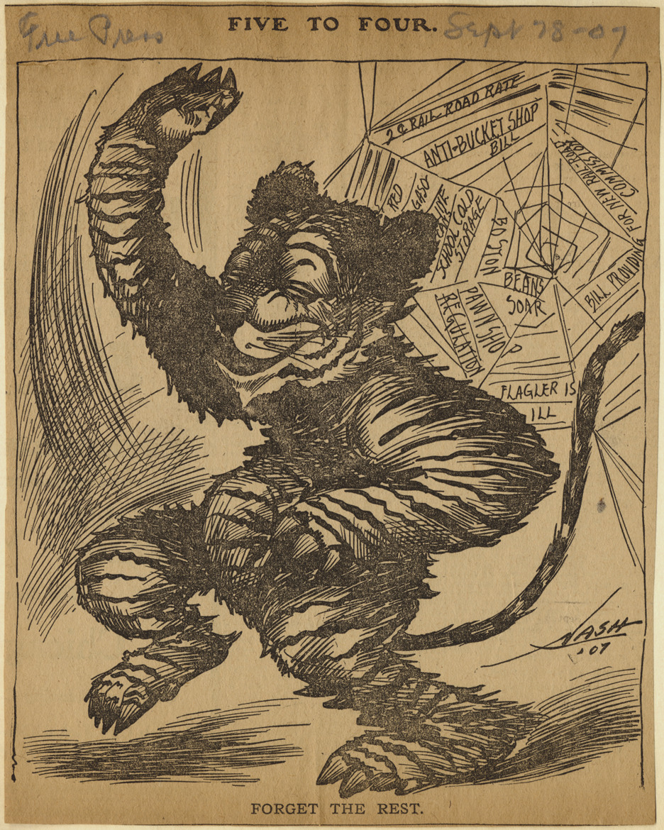 Detroit Free Press newspaper cartoon depicting laughing tiger in front of spider web. Printed on cartoon: "2 [cent] railroad rate, anti-bucket shop bill, Boston Beans soar, Flagler is ill, pawn shop regulation, red gasoline cans, school cold storage, bill providing for new rail-road commission." Caption on cartoon: "Five to four, forget the rest." Artwork is signed "Nash '07." Handwritten on front: "Free Press, Sept 28-07."