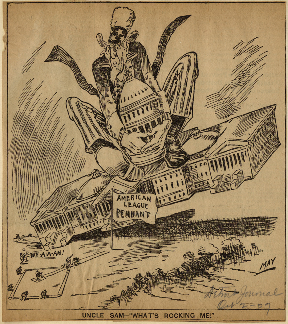 Detroit Journal newspaper cartoon depicting seated Uncle Sam holding on to tilted U.S. Capitol building. Baseball game in foreground with flag labeled as "American League pennant." Caption on cartoon: "Uncle Sam - 'What's rocking me!'" Artwork is signed "May." Handwritten on front: "Detroit Journal, Oct 2-1907."