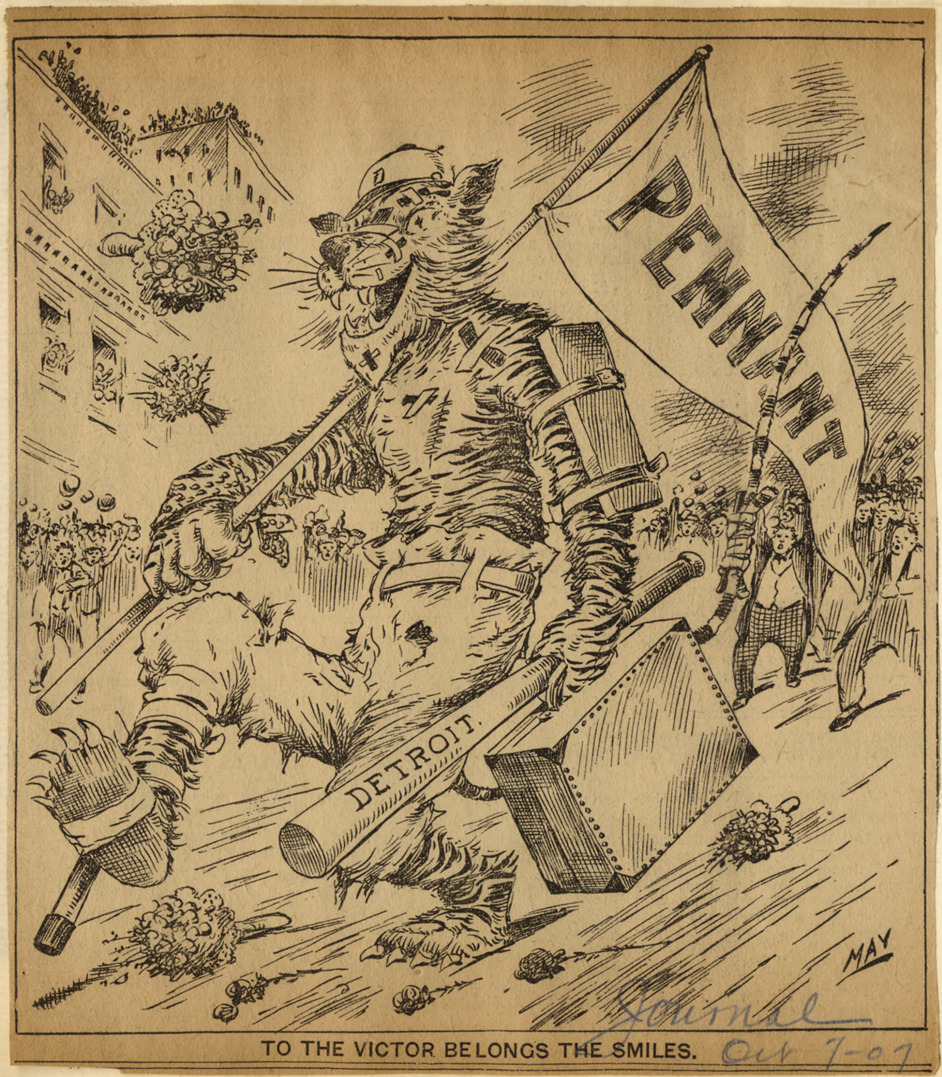 Detroit Journal newspaper cartoon depicting injured tiger wearing baseball uniform carrying "Pennant" flag, "Detroit" bat and suitcase; cheering crowd in background. Caption on cartoon: "To the victor belongs the smiles." Artwork is signed "May." Handwritten on front: "Journal, Oct 7-1907."