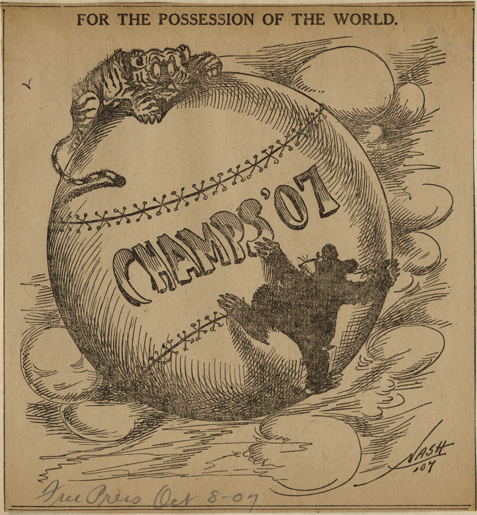 Detroit Free Press newspaper cartoon depicting tiger and bear crawling on "Champs '07" baseball. Caption on cartoon: "For possession of the world." Artwork is signed "Nash '07." Handwritten on front: "Free Press, Oct 8-1907."