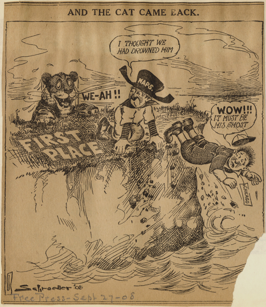Detroit Free Press newspaper cartoon depicting drenched tiger emerging from water while men identified as "Chicago" and "Naps" jump from "First place" cliff. "Naps" man says: "I thought we had drowned him. "Chicago" man says: "Wow must be his ghost." Caption on cartoon: "And the cat came back." Artwork is signed "Schroeder '08." Handwritten on front: "Free Press, Sept 27-08."
