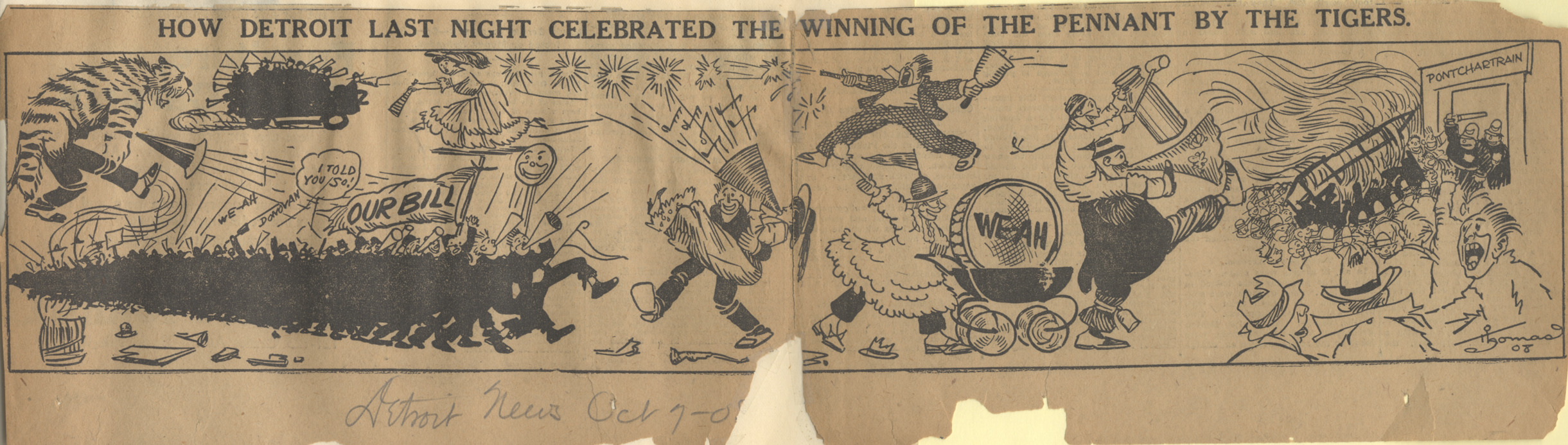 Detroit News newspaper cartoon depicting fans with megaphones, drums and bell; marching band displays "Our Bill" sign. Caption on cartoon: "How Detroit last night celebrated the winning of the pennant by the Tigers." Artwork is signed "Thomas 08." Handwritten on front: "Det. News, Oct 7-08."