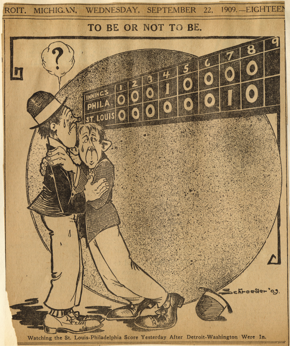 Newspaper cartoon depicting two tearful men in front of scoreboard for Philadelphia-St. Louis baseball game; tied score at eighth inning. Caption on cartoon: "To be or not to be. Watching the St. Louis-Philadelphia score yesterday after Detroit-Washington were in." Artwork is signed "Schroeder '09." Printed on clipping: "Wednesday, September 22, 1909."