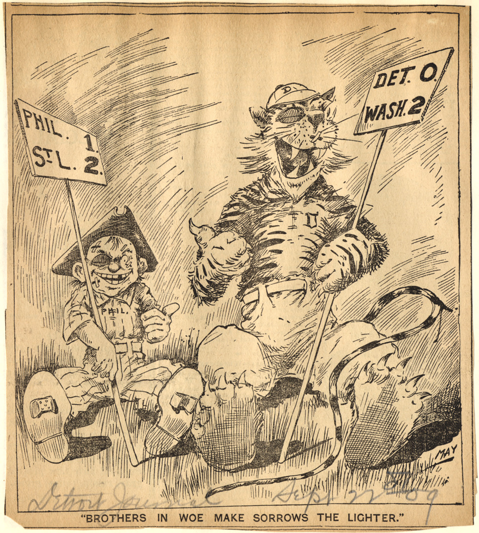 Detroit Journal newspaper cartoon depicting battered and bandaged tiger and Philadelphia Athletics baseball player giving the "thumbs up" sign. Ballplayer holds "Phil. 1, St. L, 2" sign; tiger holds "Det. 0, Wash. 2" sign. Caption on cartoon: "Brothers in woe make sorrows the lighter." Artwork is signed "May." Handwritten on front: "Detroit Journal, Sept. 22-09."