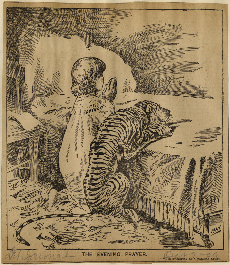 Detroit Journal newspaper cartoon depicting tiger and child kneeling and saying prayers before bedtime; child identified as "Miss Detroit." Caption on cartoon: "The evening prayer." Artwork is signed "May." Handwritten on front: "Det. Journal, Oct. 7-09."