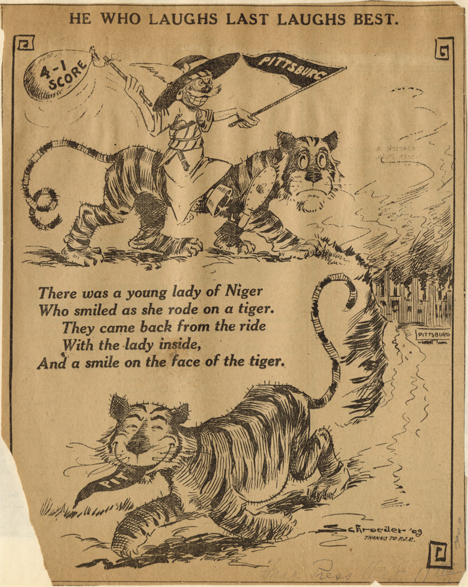 Detroit Free Press newspaper cartoon depicting pirate dressed as a woman riding on back of tiger; pirate holds "Pittsburgh" and "4-1 score" flags. Smiling tiger, with Pittsburgh pennant in mouth, returns from Pittsburgh. Artwork is signed "Schroeder '09. Thanks to P.J.R." Captions on cartoon: "He who laughs last laughs best. There was a young lady of Niger, who smiled as she rode on a tiger. They came back from the ride with the lady inside, and a smile on the face of the tiger." Handwritten on front: "Free Press, Oct. 11th, 1909."